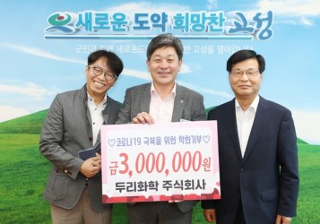 두리화학은 6월 19일 고성군청을 방문해 코로나19 극복을 위한 착한기부릴레이에 동참 의사를 밝히며 성금 300만 원을 전..