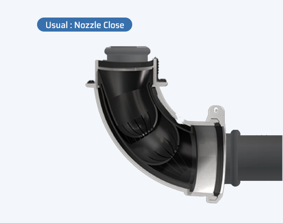 An innovative technology that controls the behavior of the drainage fluid by placing an elastic soft nozzle that varies depending on the flow rate in the elbow of the toilet to suppress noise and limit the external transmission of the generated noise